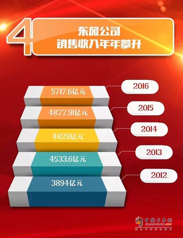 銷售收入:東風(fēng)公司從2012年的3894億元增長至2016年的5717.6億元。