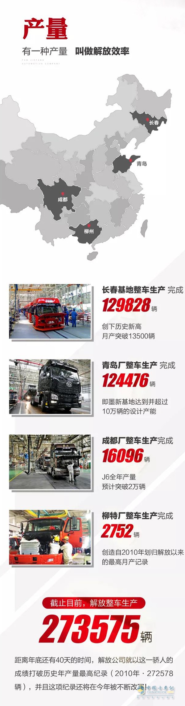 產(chǎn)量銷量雙項騰飛,質(zhì)量服務持續(xù)領航,截止目前,解放整車生產(chǎn)273575輛,打破歷史年產(chǎn)最高紀錄。
