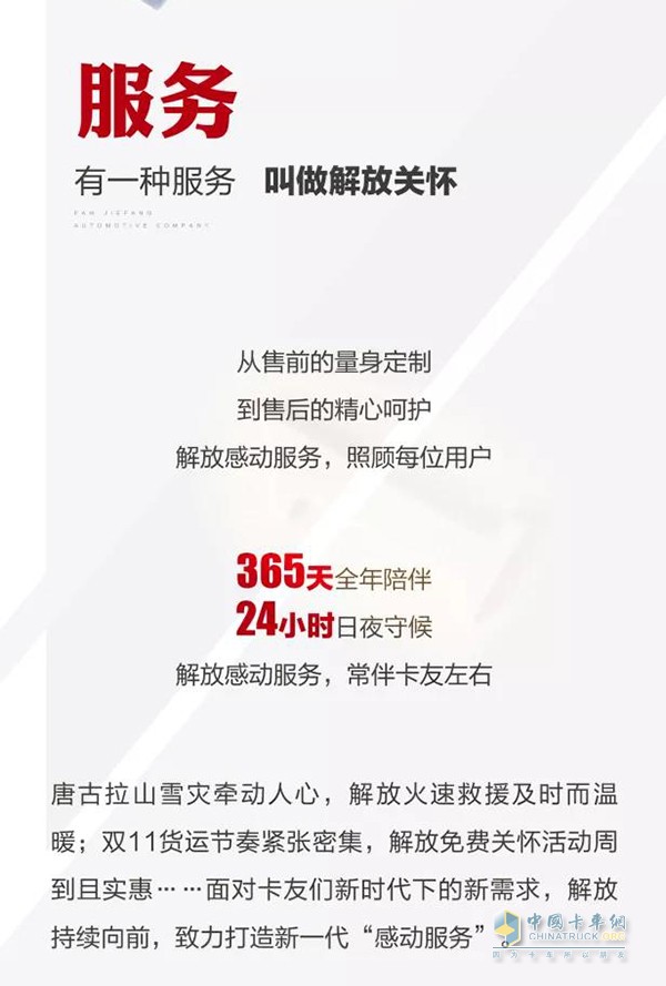 有一種服務叫解放關(guān)懷,從售前到售后的精心服務,解放常伴卡友左右。