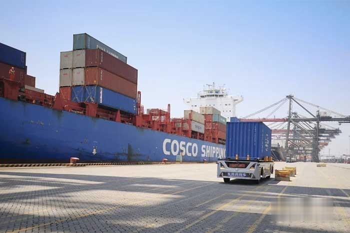 2020年5月11日,一輛港口無人駕駛集裝箱卡車從中遠(yuǎn)海運(yùn)“玫瑰輪”船邊102號岸橋下交箱裝船,